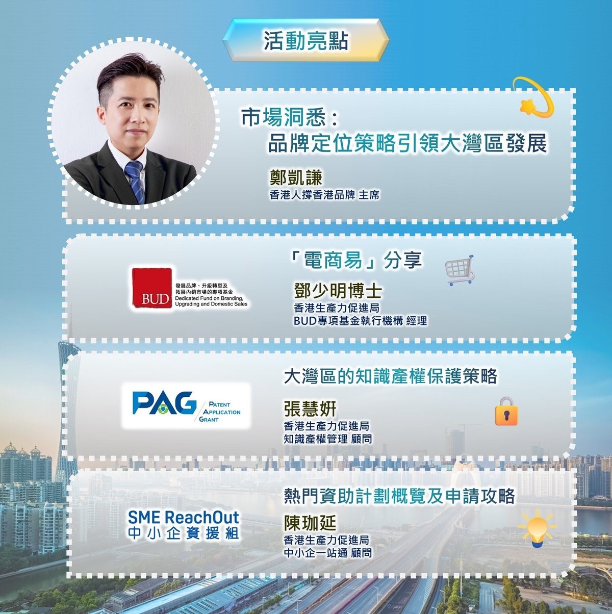 透過本研討會,行業專家及資助機構代表將為您分享在大灣區應用的品牌定位策略、教您保護品牌知識產權,並為您拆解如何善用政府資助,推動您的品牌進入大灣區市場!