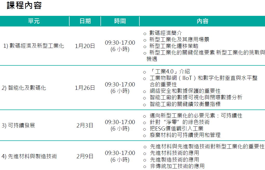 | 日期及 時間 | 2026年1月20日(星期二) 2026年1月26日(星期一) 2026年2月3日(星期二) 2026年2月9日(星期⼀) 09:30 –17:00 (每節6小時) |