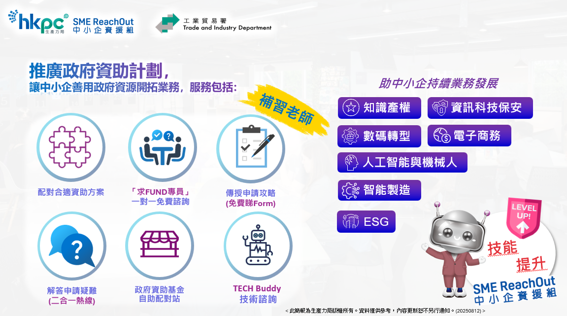 「中小企資援組」由工業貿易署委托生產力局於2020年開始營運,「中小企資援組」(SME ReachOut)支援小隊透過與中小企直接會談,協助配對合適的資助計劃方案,解答申請 上的疑問,更提供免費一對一咨詢及睇Form服務,鼓勵中小企善用政府資助升級轉型。 此外,「中小企資援組」將加強力度透過技術支援咨詢及多元化外展活動,全方位協助中小企持續發展。